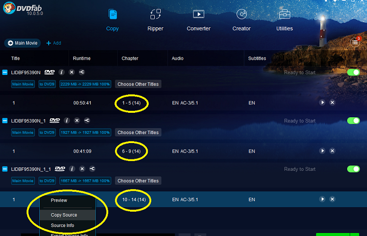 CaedenV Many TV shows like to bundle 6-7 episodes on a disc and split it up by chapters. Episode 1 being chapters 1-5, episode 2 would be 6-10 etc. etc. etc.Back in the DVDFab 8/9 days you could simply copy the source a few times, and assign each 'copy' to the chapters relating to each episode.Where is this option in DVDFab 10? I have been looking for a while now and I can't seem to find it.I appreciate the help! Thanks!