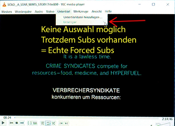 Als Beispiel mal eine Film in der Art StarWars, ... Als ForcedSubs werden da die Stellen bezeichnet, in denen nur AlienSprache in den UTs auftaucht > aber man muss sie anwählen. / (ist zB. bei Solo eine Star Wars Story so ... von oben die zweite Deutsche ist diese PseudoForced)