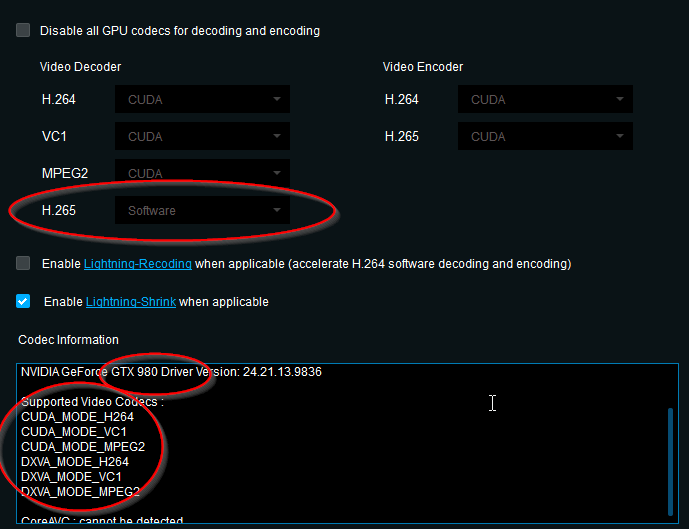 GTX 1050 and its successors (1060, 1070, etc.) in the 1000 series. But then you said you used it before with your 980 card. You might want to temporarily reload an older video driver that worked with hardware decoding and see if can be enabled. Also, did you try unchecking the "Enable Lighting Shrink ..." box and manually selecting CUDA?