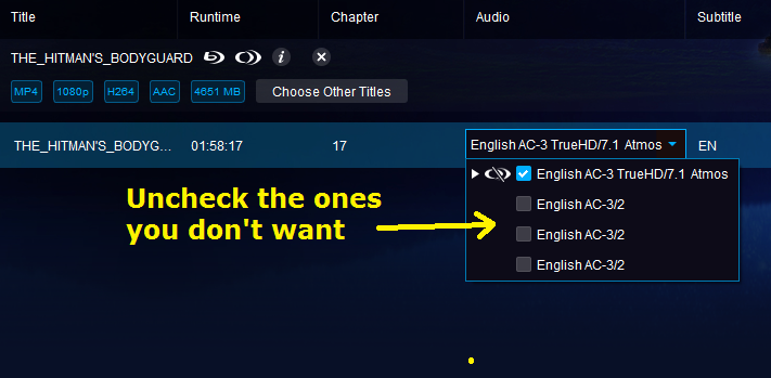 You must select the audio stream you want before starting Ripper, as shown in the capture. If you are using Passthrough, all the audios will be present unless you remove them and you must select the one you want with your player. The one with the white arrow just to its left will be the one that is played by default.