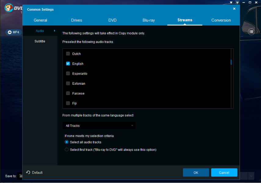 Under the Audio selection drop-down list on the main screen, you can select/deselect which audio streams you want included in the rip. Typically for most blu-rays, the HD audio (e.g. DTS HD Master, or Dolby Digital TrueHD, or both) are the main audio streams and Dolby Digital AC3's are usually descriptive audio, director's comments, etc. Some older blu-rays only have Dolby Digital AC3 only and no HD. Simply deselect the descriptive audio if you do not want that.