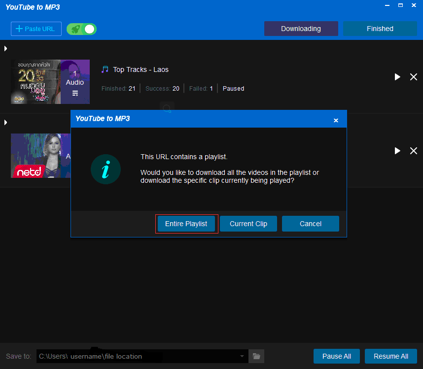 A: Follow steps 1 - 4 as above, but select a playlist instead if you have created one. YouTube to MP3 will automatically detect that you have pasted a playlist URL and will present the screen shown in the capture below so that you can choose "Current Clip" or "Entire Playlist". After you make the choice, click the "Download" to begin the process which is illustrated in the additional captures.
