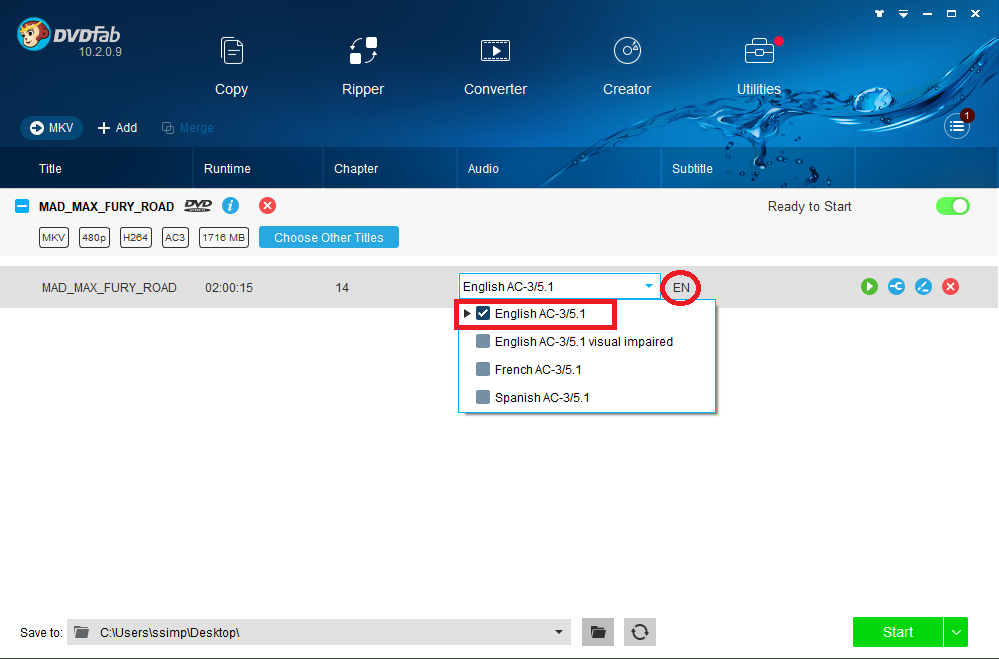 The Audio will show as "EN AC-3/5.1" if you go ahead and click the Start button, then later check the resulting video file, you sometimes find that the movie is ruined with the wrong audio track.
