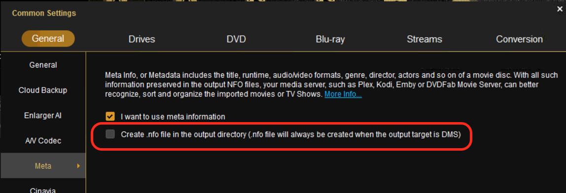 The option to not create NFO files is in Common Settings > General > Meta section.