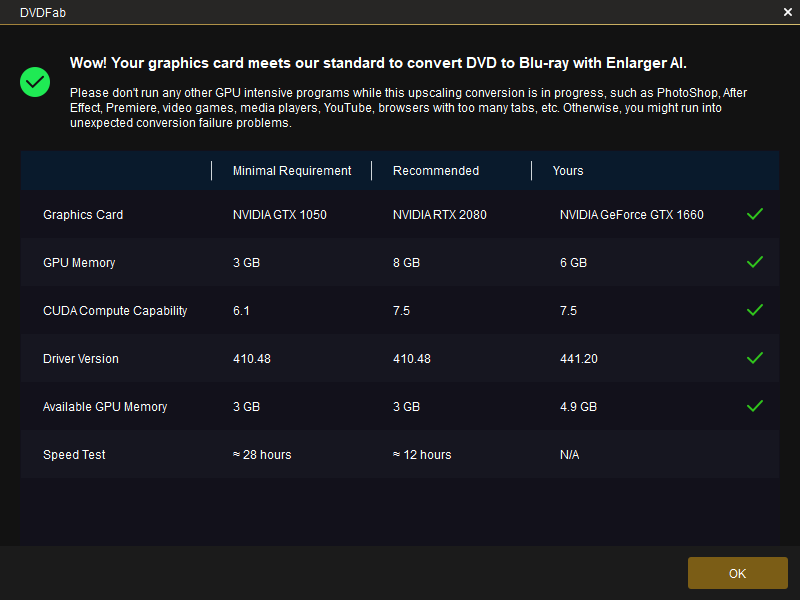 A: DVDFab will check and list the specification of your graphics card before starting to convert DVD to Blu-ray with Enlarger AI. See the attached pic.