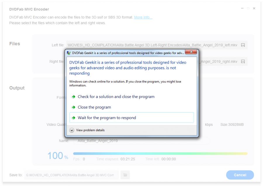 I can't help but feel frustrated as I never had problems with other DVDFab tools and got Geekit MVC because I love the idea of tweaking my 3D films in other software and then being able to build them from left/right eye into a playable MVC structure. Sadly every time I use Geekit it doesn't work. First with Ready Player One a while back and now with Alita. It would be great if you guys could fix it but I'm really starting to lose faith and feel like I've wasted my money at this point.