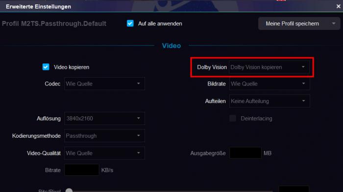 ich benutze DVDFab v11.0.8.9 - Lese einen 4K UHD Film ein, Rippe ihn immer in m2ts Pass., und wenn ich dann rechts auf den Schraubenschlüssel gehe unter "Erweiterte Einstellungen" steht unter "Dolby Vision" immer: "Dolby Vision Entfernen". Egal ob ich vorher auf "Dolby Vision kopieren" gegangen bin, beim nächsten 4K UHD Film steht es wieder auf "Entfernen". Muss das nicht mit kopiert werden? BluRay Filme Rippe ich auch in m2ts Pass. Hat diese Einstellung damit vielleicht etwas zu tun?