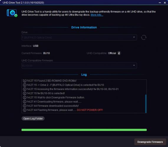 When I attempted to copy a newly purchased 4K UHD movie (Midway) I was prompted by DVDFab 12 that the firmware on my BUFFALO UHD BD Portable Blu-ray Drive Black BRUHD-PU3-BK was not the correct one. Even though I used the drive to copy a movie yesterday, I followed the instructions to downgrade the firmware using the UHD_Drive_Tool2. The tool has now been running for over an hour. The first time I used the tool to flash the firmware it took less than 2 minutes. I am attaching a snip of the Tool screen and the UHD_Drive_Tool2 log. I don't want to turn off the computer and risk losing the brand new Buffalo drive, hopefully someone smarter out there can help me. [ATTACH]n388813[/ATTACH]