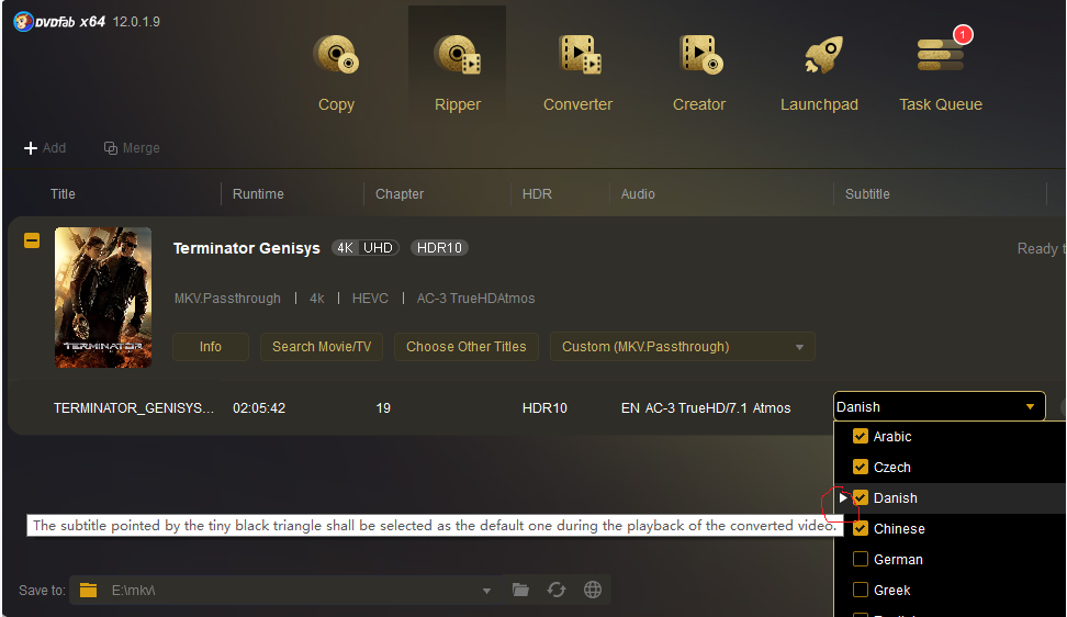 UHD 50GB You can use Blu-ray Creator / UHD Creator to convert the MKV file to Blu-ray / UHD, the Dolby True HD / Atmos sound will be preserved.MonaBut when the mkv. File has multiple audio tracks, cannot the audio track be selected?