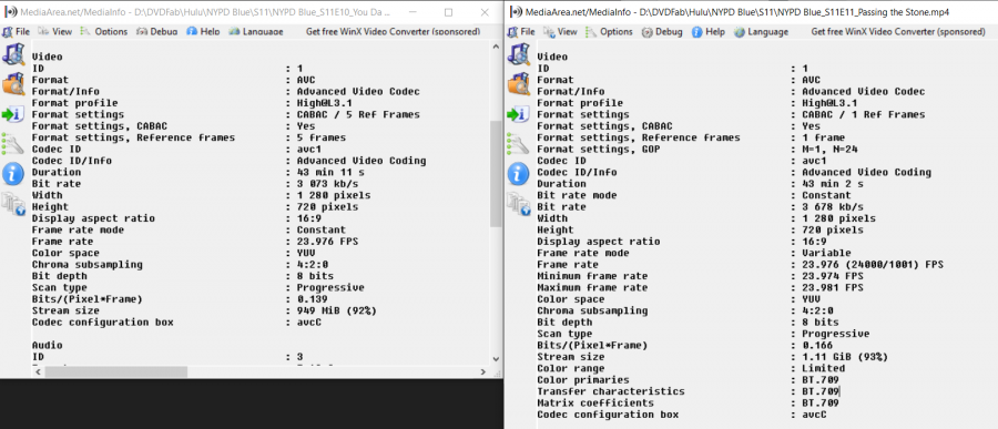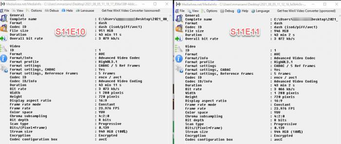 Here is where it gets odd... I pulled the VIDEO files for both episodes from the TEMP folder when download was done, but before StreamFab reported the episode was DONE. These are the raw videos as downloaded BEFORE any processing, re-encoding, or remixing was done. There is no audio in these files yet.