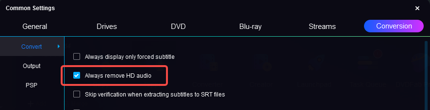 Once I have ticked the "Always remove HD audio" option in "Common Settings > Conversion", I do not have to tick that option manually. Maybe you can uninstall and then install the latest 12.0.5.2 to have a try?