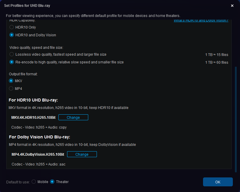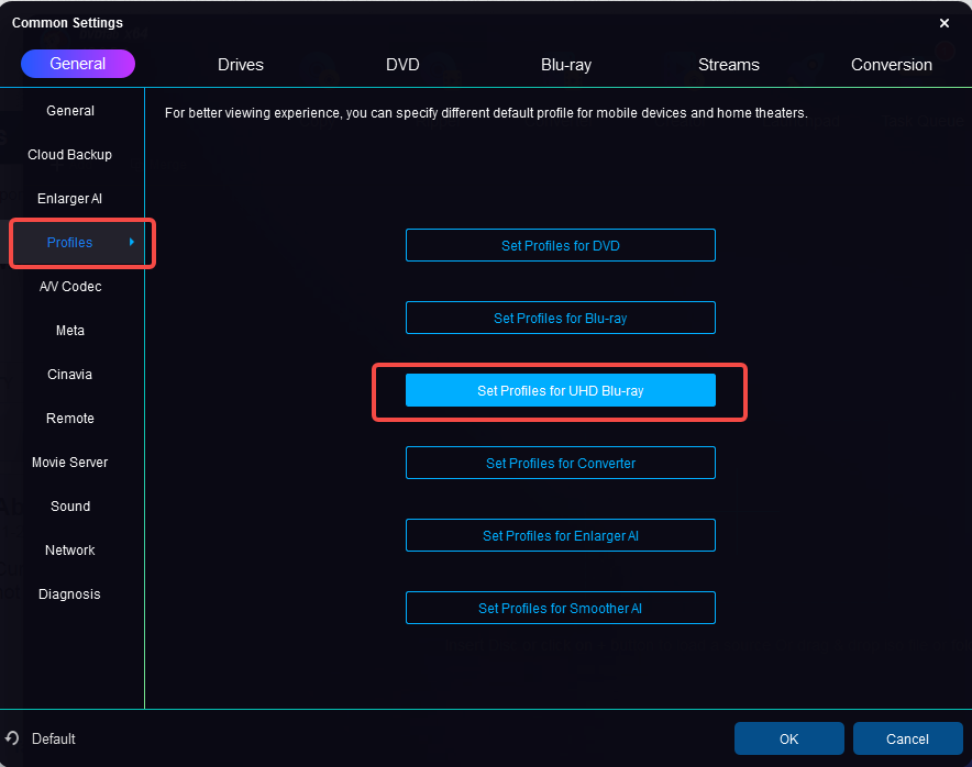 Please go to Common Settings > General > Profiles to adjust the settings for UHD movies. See the images attached in my post above