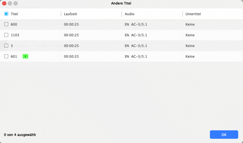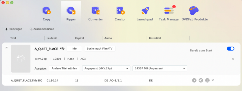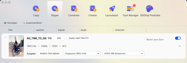 Kendlinger Hallo,habe versucht den neuen Bond (BluRay) mit BluRay-Ripper (Mac-Version) zu konvertieren. Die BluRay wird eingelesen aber es erscheint keine Sprachauswahl etc. wie bei einer BluRay (A QUIET PLACE) die korrekt eingelesen wird (siehe Screenshots). Auch wenn ich auf andere Titel klicke, kommt nur eine magere Auswahl. Die BluRay läuft aber in einem BluRay-Player (angeschlossen an den Fernseher) normal. Ist das ein neuer Kopierschutz? Was kann ich tun?Vielen Dank und frohe WeihnachtenThomas