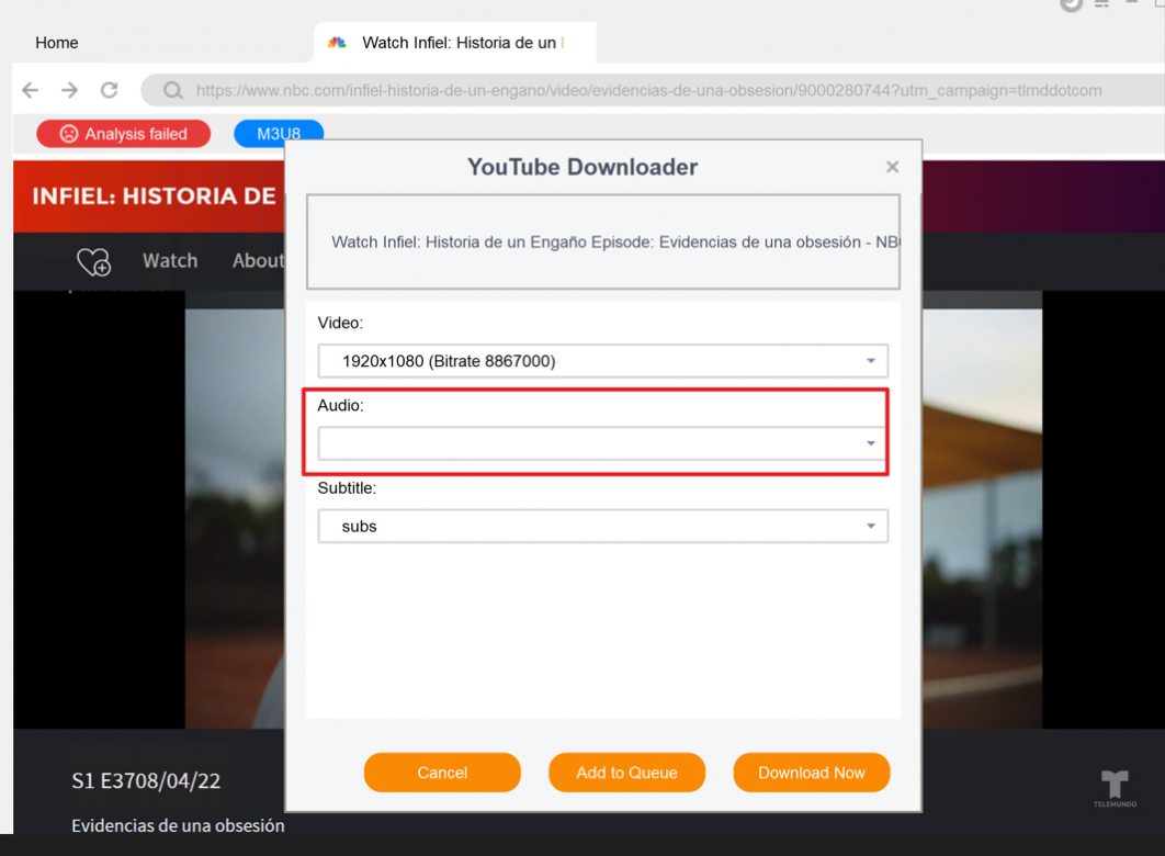 Mona https://www.nbc.com/infiel-historia-de-un-engano/video/evidencias-de-una-obsesion/9000280744?utm_campaign=tlmddotcomWe tested the link using expressvpn, US. There is no audio option for selecting but the video can be downloaded well.