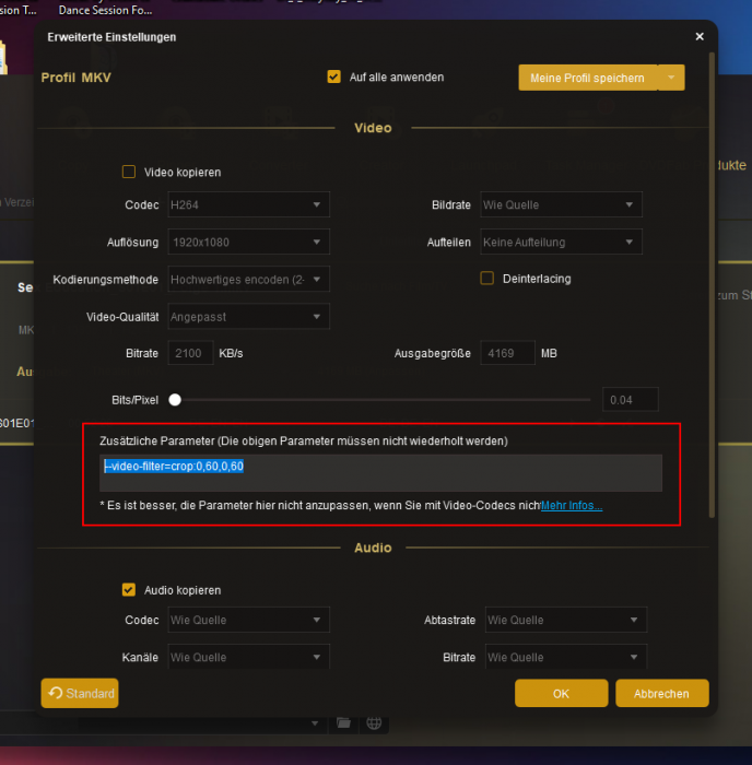 Hello everyone, I want to crop the frame size of a video file. According to the parameter help, it should be possible to implement this.