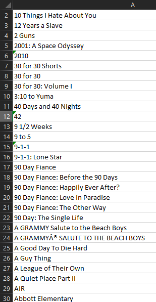 Then i took the results, manipulated them with sorts, search and replaces, and deleting duplicate lines to go from 600,000+ lines down to 860 lines that give me a list of all Movies and TV Shows.