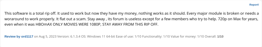 You might want to review all of @ord117 posts especially the ones from this year. He is clearly acting in a berserk manner and giving many indications of being a troll bent on putting down DVDFab and all of its products. In reviewing his body of work posted on the various DVDFab forums he has not contributed anything helpful to other users and is continually trying to provoke arguments. In one message thread he accused another user of "having a stick up his ass".