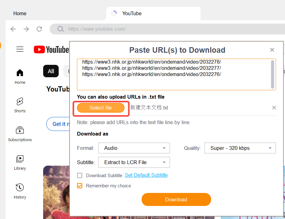 Mona To add more than one video link to the download queue, you can save those links in a text file, and then select that file to proceed.
