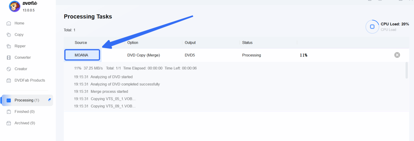 files into the merge module and hit start. after it finished, both side A and B are merged into one 7.91GB file.