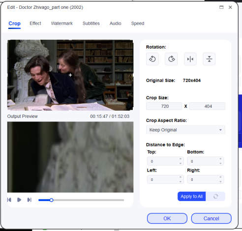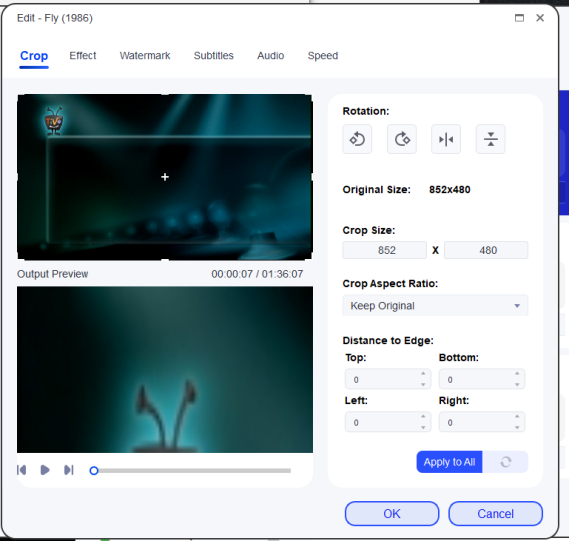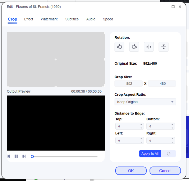 In this screen snip, I have just clicked on the Crop tool and NOTHING ELSE. What is shown is the very first screen that is displayed. Here, the source window looks normal, but you can see in he Output Preview that it is displaying only a massively expanded little snip of the original video from the very upper left corner! If it wasn't for that little character with the two antenna in that spot, there would be no way at all to tell what was playing. With this file, every single time I try to use one of these tools, the display is screwed up like this.