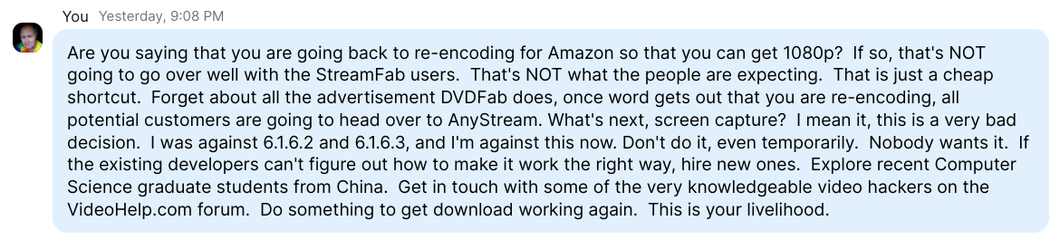 My point is, as I read comments in this forum, on Reddit, and elsewhere, more and more users are becoming dissatisfied, or they are users who were satisfied that are now beginning to look at options. That will not be good for FAB. With physical media purchases becoming less and less convenient, at least in the USA, Streaming is an important part of Fab's continued success. If they keep this up, I fear they wont have new customers for StreamFab.