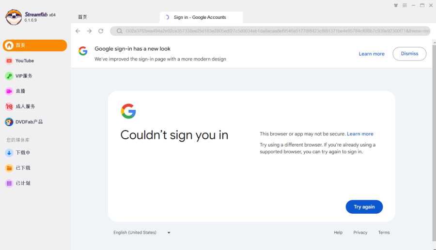When I logged into my YouTube account, I was blocked by Google and prompted that it was not safe. I used the method provided by Streamfab, cleared the cache, and uninstalled and reinstalled it. I asked Streamfab customer service, but they didn't know how to solve it. My computer is Windows 11, and both browsers Edge and Chrome are the latest versions. I tried both browsers but they didn't work. Does anyone on this forum know how to solve this problem?