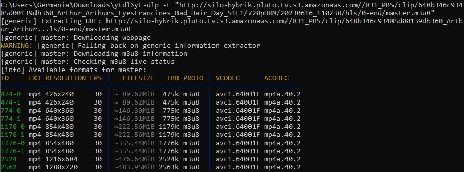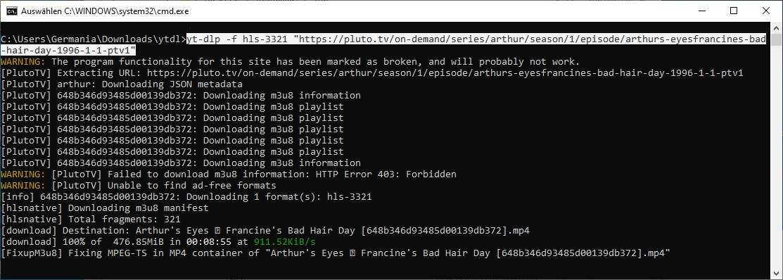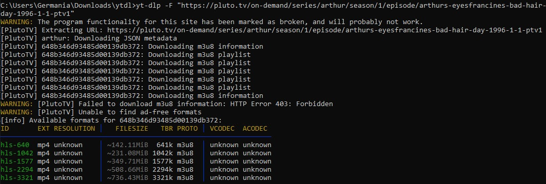 Germania I suspect SF uses yt-dlp for this - it works for me - more info herepluto have two versions: unprotected with Ads - and protected without ads:s01e01 unprotecteds01e01 protected