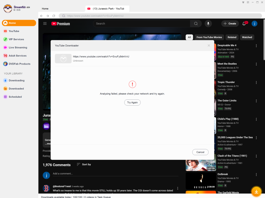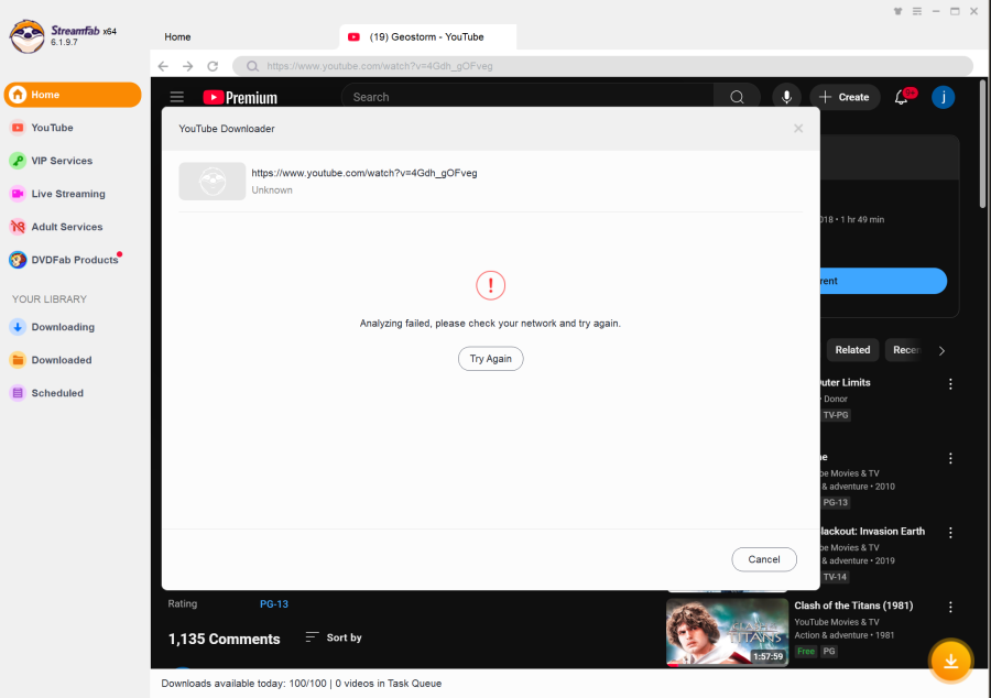 You may have internet, but if you are using Windows, the Windows firewall may be acting up and blocking the YouTube service in streamfab from accessing the internet.