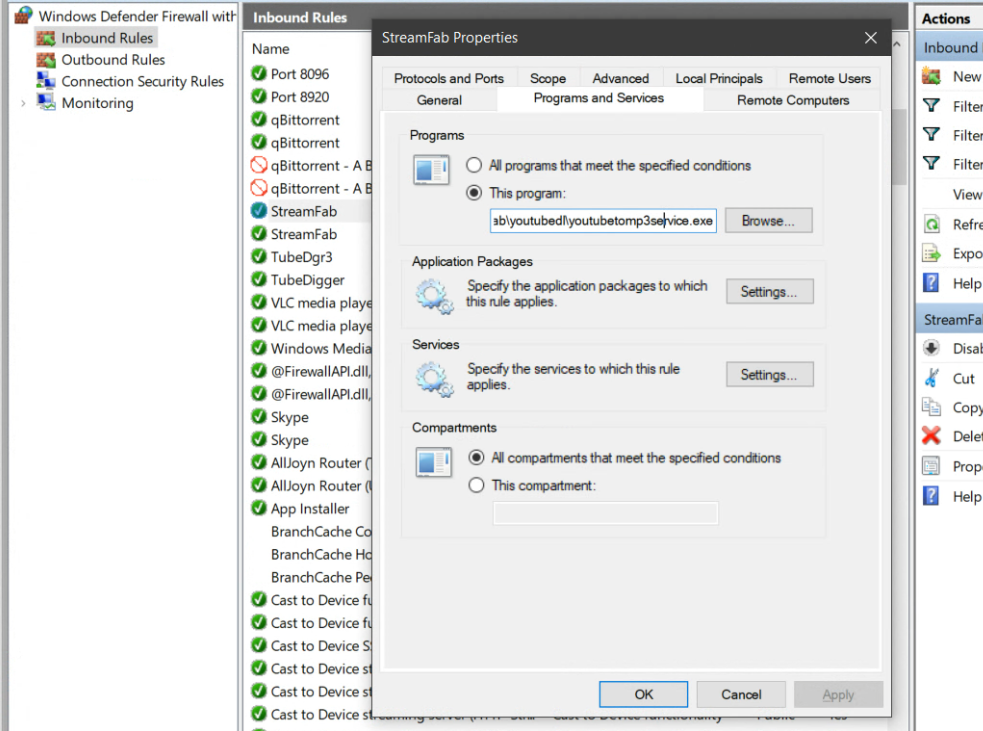 Cats4U: I was able to create/add the inbound firewall rules for youtubetomp3services.exe and enabled them. I don't see the youtubetomp3service.exe listed in my services at all. Can I add it and if so how do I do that? Again, thank you for your help.