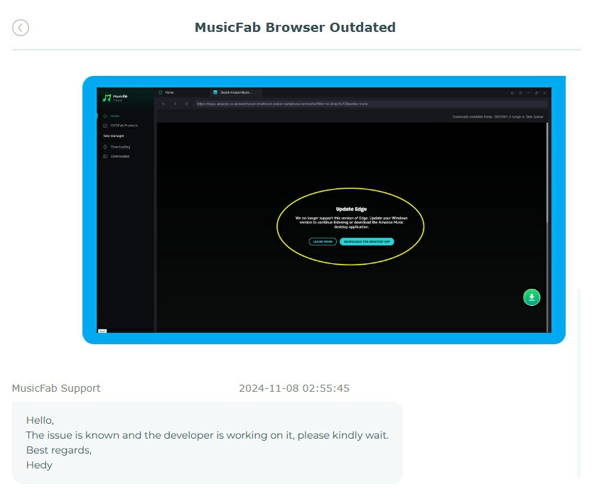 This is a recurring issue. I thought they had it solved. Sorry to hear that it has reared its ugly head again. Although the usual response from the "Fab" team, is to clear the cache in the internal browser, and if that doesn't work, Uninstall and reinstall; this sometimes doesn't work, and the issue needs to be addressed by the development team. If the problem persists after following the recommended actions, I recommend posting a ticket at dvdfab.cn. You will have to log in to submit a ticket. Your MusicFab credentials should get you in. This is a member portal for DVDFab, MusicFab, StreamFab, and most of the other "Fab" products. "The squeaky wheel gets the grease".