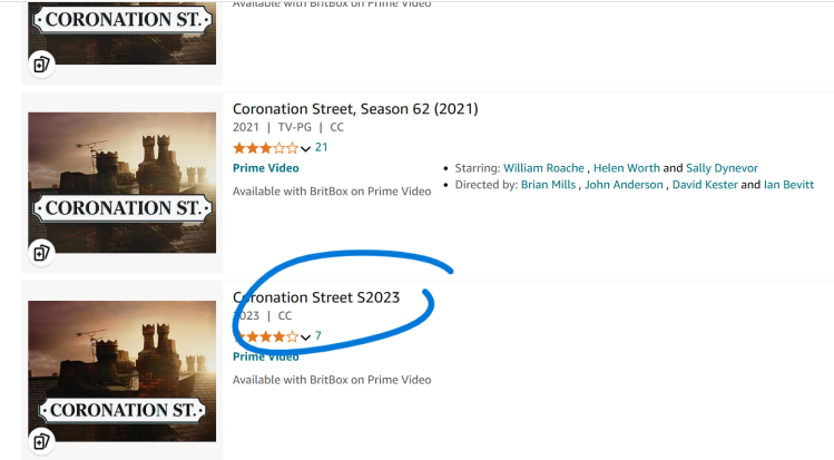 Coronation Street is available for streaming in the US through Prime (not BritBox), despite the deceptive "available through BritBox" claims you see on the Prime Video page for seasons 58-65.