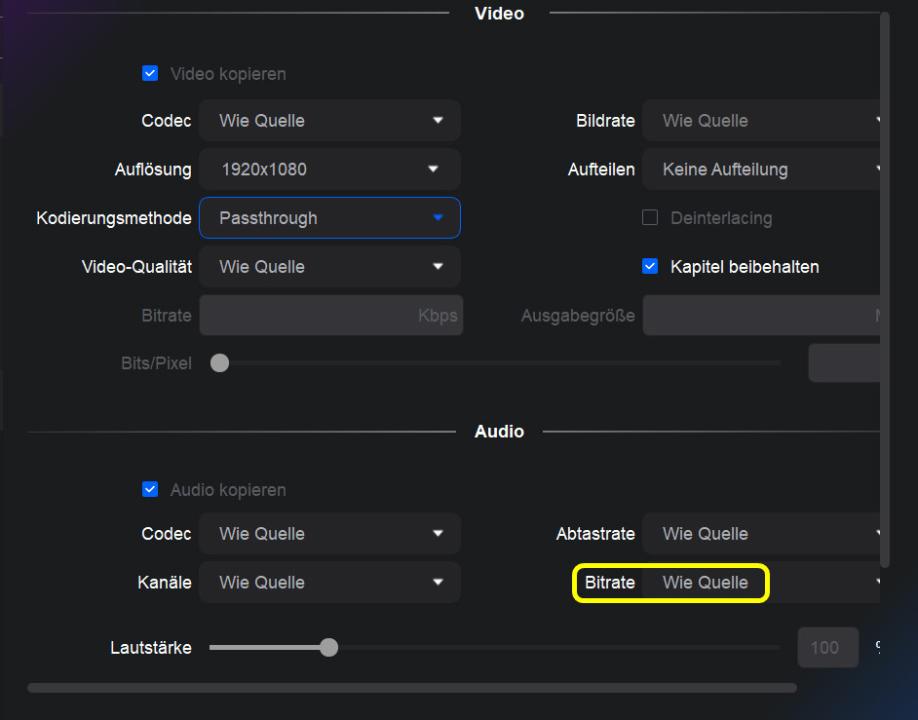 Sorry wenn ich mich nochmal melde :). Also Originales "Passthrough" mache ich nicht. Das Video wird immer kopiert was ja dann "Passthrough" entspricht, Audio/Ton ändere ich grundsätzlich in