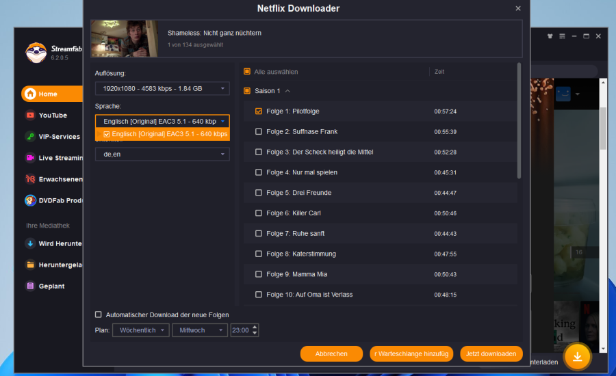 Bei der Serie Shameless (Netflix) wird mir der Download der Staffeln/Folgen nur mit der Sprache Englisch angeboten (egal ob ich im Profil Haupt oder Hoch einstelle), obwohl auch Deutsch in der Auswahl ist beim normalen Anschauen (Chrome, Roku-Stick etc. s. Screenshots). Betrifft so weit ich das sehe auch nur die Serie, alle anderen Serien und Filme bekomme ich in Deutsch und Englisch zum Download angeboten. Gibt es da irgendeinen "Trick" den ich anwenden kann? Bei der Serie nicht weiter schlimm, da die auch bei Amazon Prime mit dabei ist. Mich würde nur generell interessieren, wie man das lösen könnte.