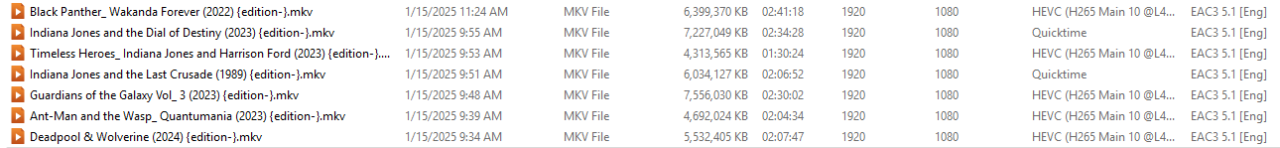 Ant-Man and the Wasp Quantumania, Deadpool & Wolverine, and Guardians of the Galaxy Vol 3 download as H265/HEVC at 1080p.