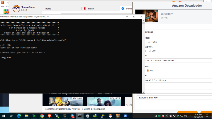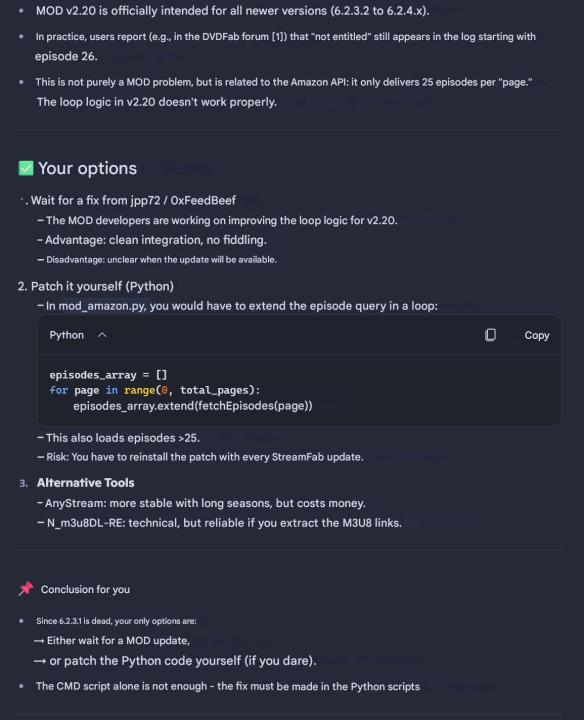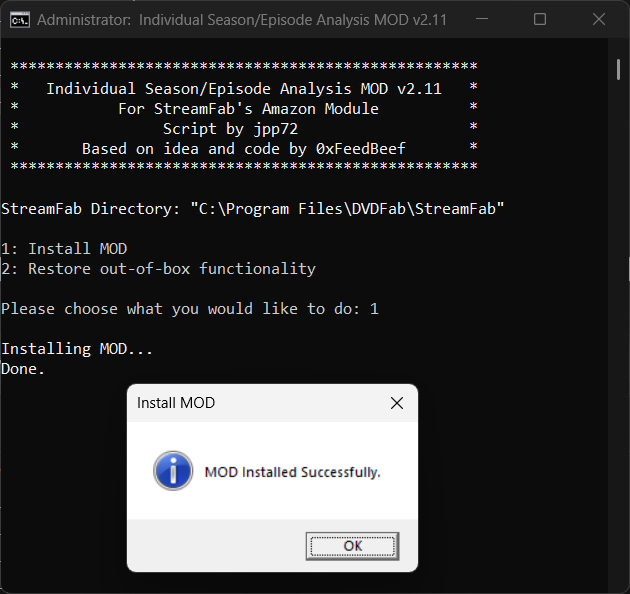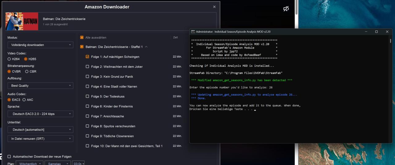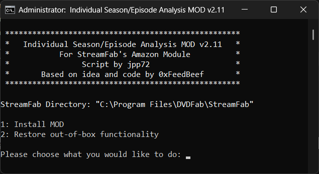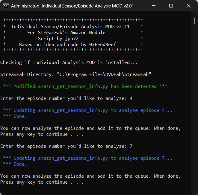 I took his findings and created 2 Windows CMD scripts for people that aren't comfortable manually editing the Python scripts. This will ensure there are no typos that will break the code. Python is extremely finicky about proper indentation. It also speeds up the process of applying the mods after a StreamFab upgrade and speeds up selecting an episode to analyze.
