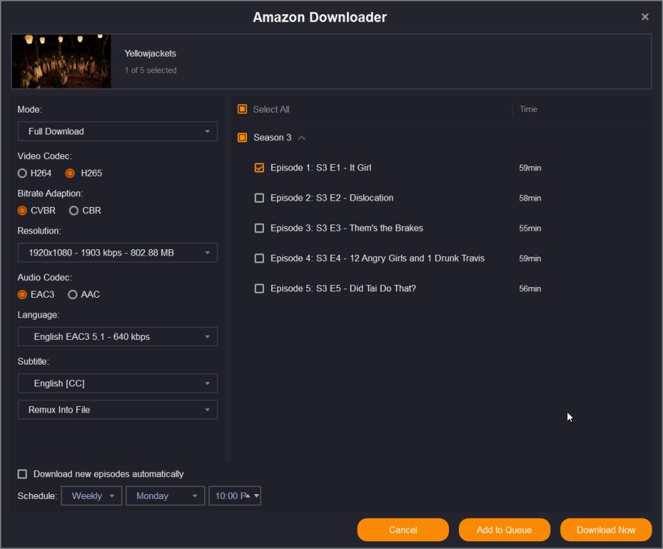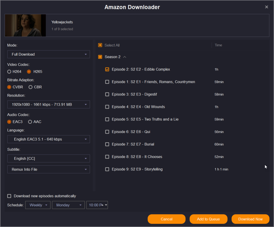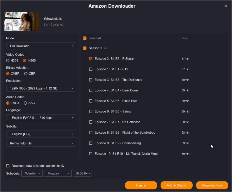 For the past two weeks I've been unable to download both recent Paramount+ and Showtime videos via my Amazon subscription. Specifically, I've tried Yellowjackets and NCIS Sydney. I'm attaching a screenshot and my log. I've done a complete uninstall and reinstall from the offline downloader. I'm currently using SF 6225, but I had the same problem with 6222. I'm running Windows 11 Pro 24H2 (not sure if installing the 2025-02 cumulative update will make any difference). I noticed from the screenshot that the language and subtitle boxes are empty when selecting H265, so I tried H264 and everything downloaded fine. I went back and selected H265 on Yellowjackets S03E02 Dislocation, which I had previously downloaded without difficulty, and it wouldn't download. I tried Ray Donovan episode 1 with H265 settings and it worked just fine. I'm not having any problems with Netflix, Hulu, Disney, Peacock, or downloading directly from Paramount+. Any assistance would be deeply appreciated.