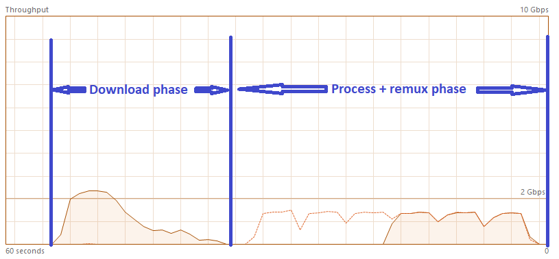 StreamFab insist (no option of turning it off) that the MOOV atom must be at the front of file (utterly unnecessary save for rare cases), so the brain-dead ffmpeg writes out a dummy version to the final destination folder, then writes out the final version over it... and it does so in tiny little chunks wasting everyone's time. So not only do you end up spending more than twice the time processing over RSS SMB as the download itself (see graph), but you're also wasting at the very least 2x writes on your SSD (and that's not counting the enormous write amplification you get from committing tiny chunks of data to disk. Even with my enterprise-grade eMLC SSDs that are rated at 45DWPD, I'm measuring below 15DWPD with write amplification due to StreamFab (and yes, that's the only thing reading and writing to that disk). I dare not think how fast consumer TLC SSD get burned through!
