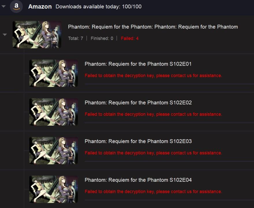 I then tried to download Phantom Requiem episodes. SF Analysed but each episode failed to download with the message "Failed to obtain the decryption Key: etc...
