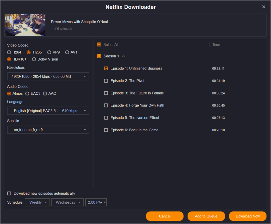 All my stuff downloads automatically with Sonarr. I tell it I prefer H265 but there are still a lot of groups that only release H264. I then use StreamFab to go get the H265 or AV1 version. The only times I used to download H264 was if Sonarr couldn't find the show AT ALL, or, like with the Australian show Fisk, season 1 could only be found by Sonarr without subtitles. Now that most people i share my library with are using modern hardware, i will NEVER get H264 from Netflix
