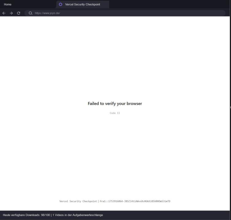 sysop Hello,Joyn does not work anymore.It displays a white page from "Vercel Security Checkpoint" with the message: Failed to verify your browserCode 11 Help is appreciated.Thanks a lot.