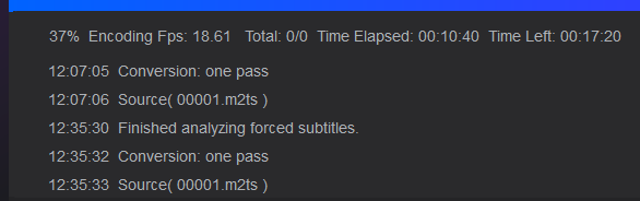 Prior to that version, the "scan forced subtitles" option would quickly scan through a source, displaying speed in MB/s. Even a large video would complete its subtitle scan in seconds. After this, it would proceed to normal encoding.