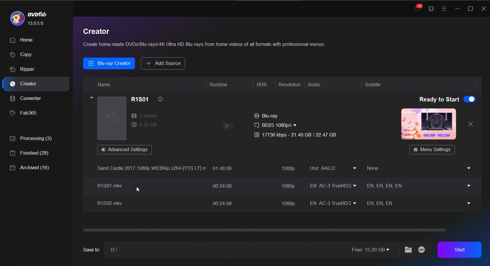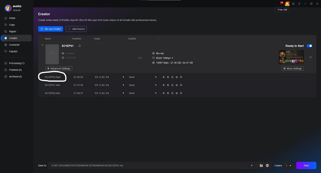 As illustrated by the screenshot below, I have 3 titles to create a Blu-ray with. Titles 1 & 2 from one internal HD, Title 3 from another internal HD, but despite renaming each title to follow in order of preference, no matter how I add them, Title 3 remains at the top and the Creator software currently prevents me from being able to manually reposition it in order of my choosing.