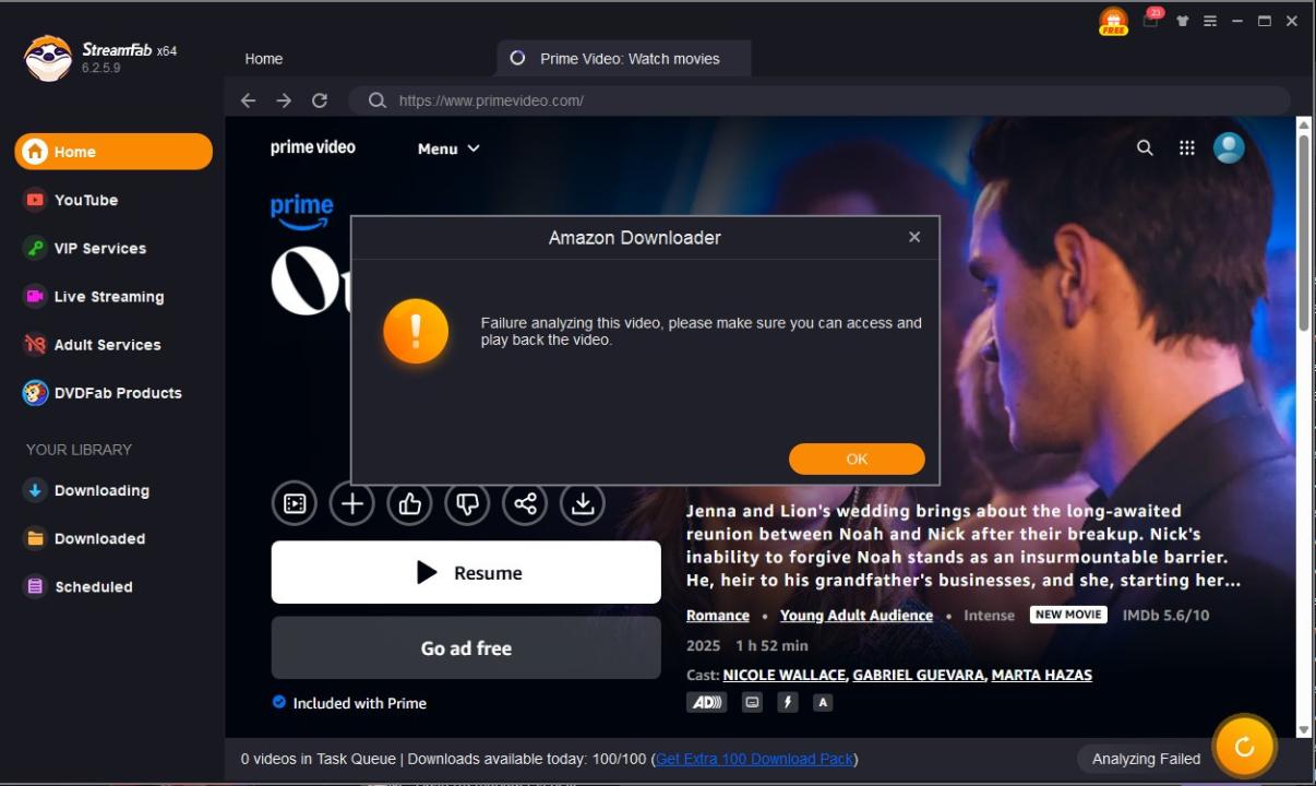 Here's my log file and I am using the app in the UK but the video I am trying to get is on the US Amazon site, which I am able to access and play within the web browser and the StreamFab app.