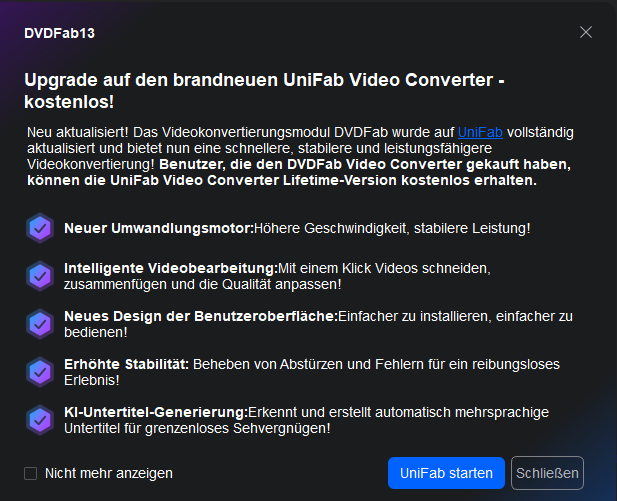 Ja, das frühere Converter-Modul in DVDFab 13 ist nicht mehr enthalten. Der Eintrag, den Sie im Menü sehen, ist lediglich eine Weiterleitung zum neuen, eigenständigen Programm UniFab. Damit möchten wir es DVDFab-13-Nutzern leichter machen, das Tool zu finden.