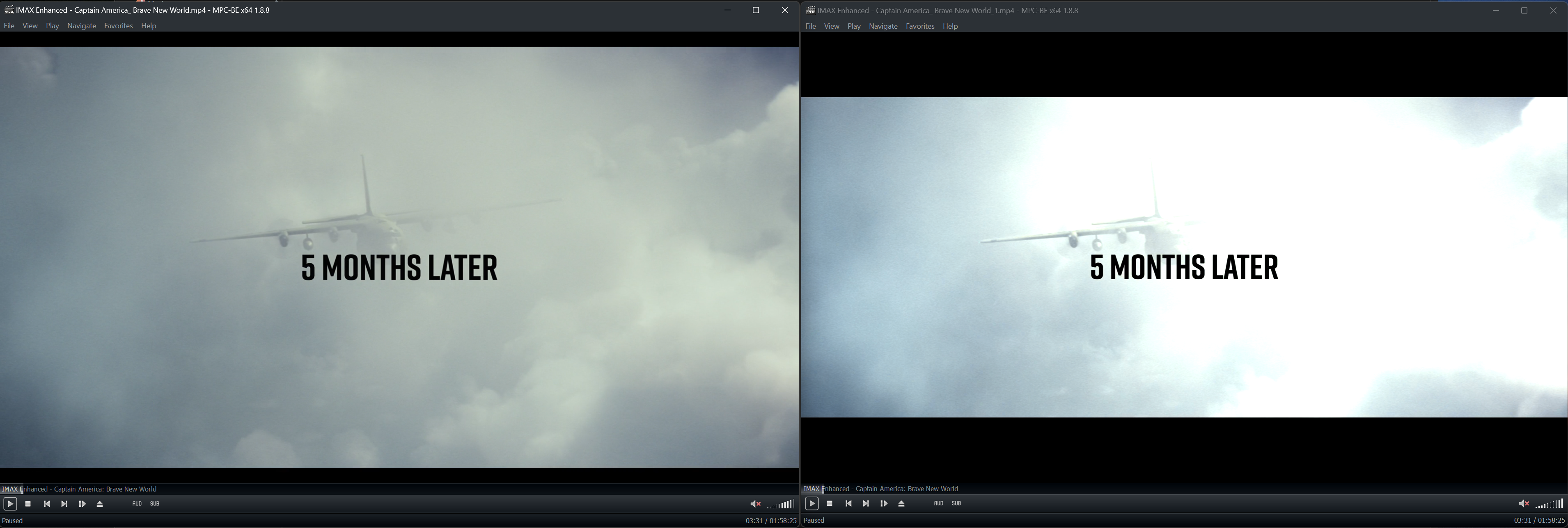 Here is an example with Brave New World at the same time. The one on the left is the working H264 1080p file and the one on the right is the H265 4K DV file. Both are supposed to be IMAX Enhanced at this scene but only the left one is.