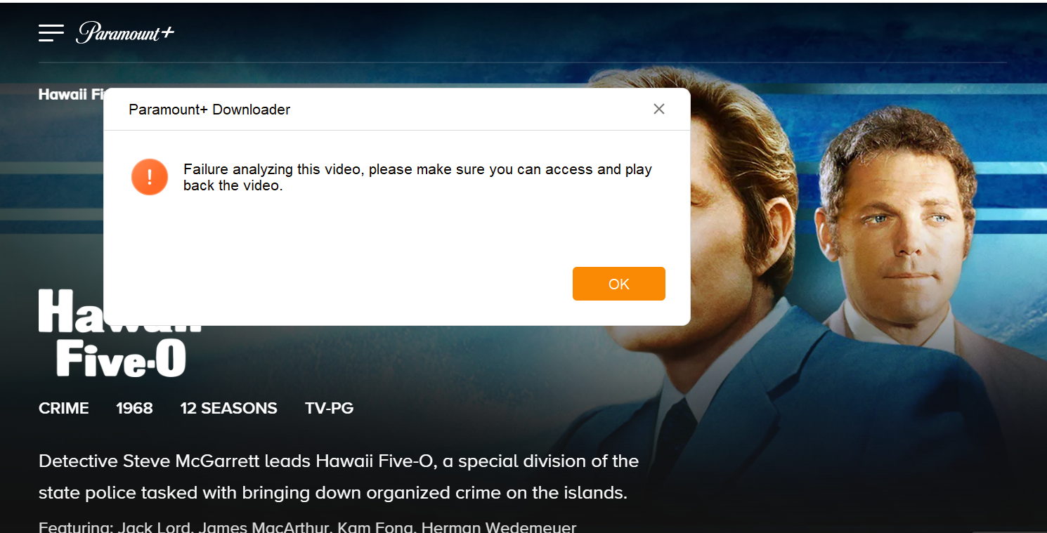 Hawaii Five-O, Classic 1960/1970 show works fine in the app, and the browser. However, Streamfab won’t/can’t open the video. Again, it works fine on a regular browser/tv app. I get the attached alert when trying to open it. Screenshot attached.