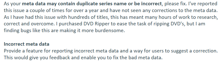 As your metadata may contain duplicate title/series name, be incorrect or missing, provide a feature for reporting incorrect or missing meta data and a way for users to suggest a correction. This would give you feedback for your review and enable you to fix the bad or add the missing metadata.