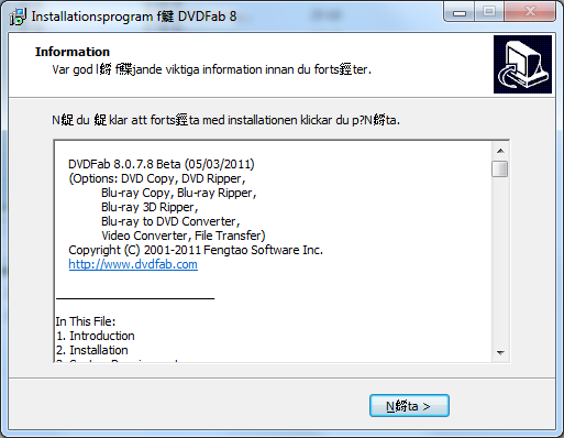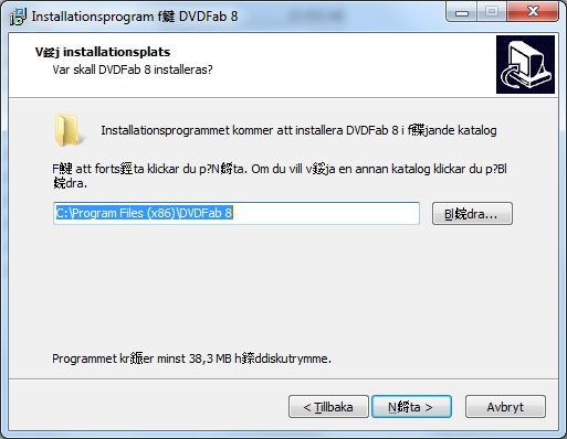 Since some versions back there is now Chinese looking characters in the Swedish text when you install DVDFab.