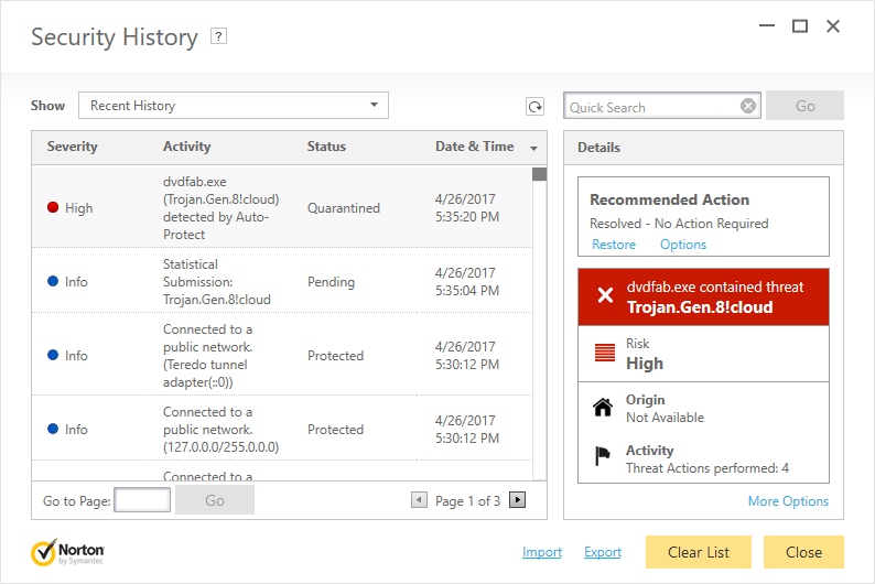 4/26/2017 8:59:38 PM,High,dvdfab.exe (Trojan.Gen.8!cloud) detected by Auto-Protect,Blocked,Resolved - No Action Required