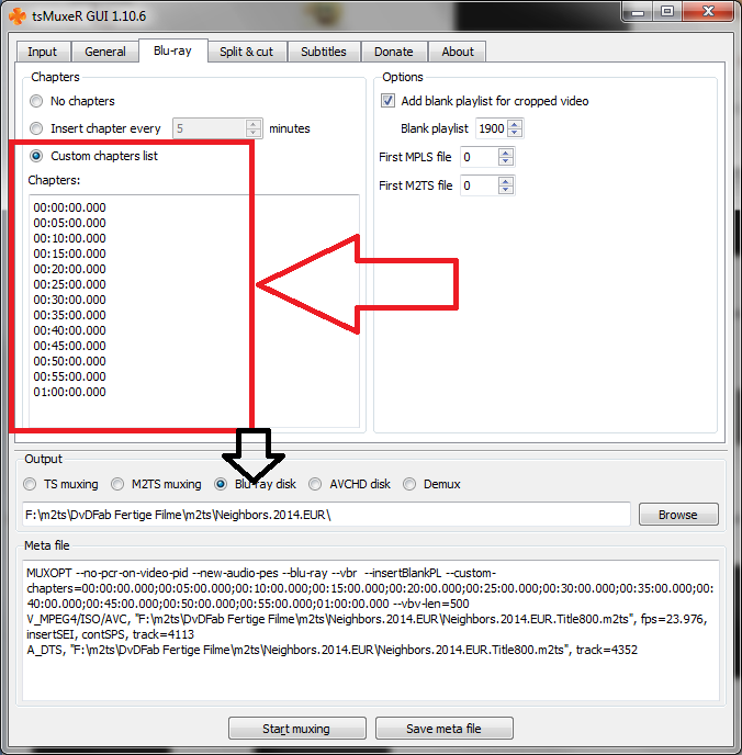 auf Blu-ray und schaue dir den Screenshot an.Sollte der Punkt auf Insert chapter every sein,macht den Punkt auf Custom chapters list siehe nächsten Screenshot